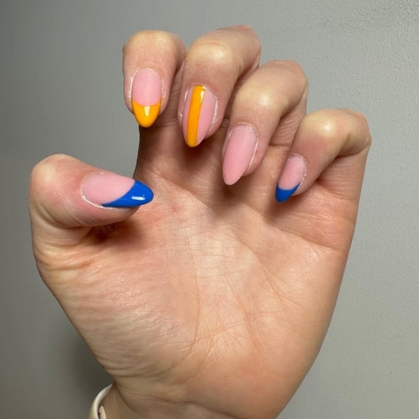 Using a fine art brush, apply GELLUX Mini Inky Blue to create a French tip on the thumb and on the little finger. Then again, using a fine line art brush, apply GELLUX Mini Lemon Meringue to the index finger creating a French tip. Next, apply again GELLUX Mini Lemon Meringue and paint a strip down the middle finger. Cure each layer for 60 seconds.