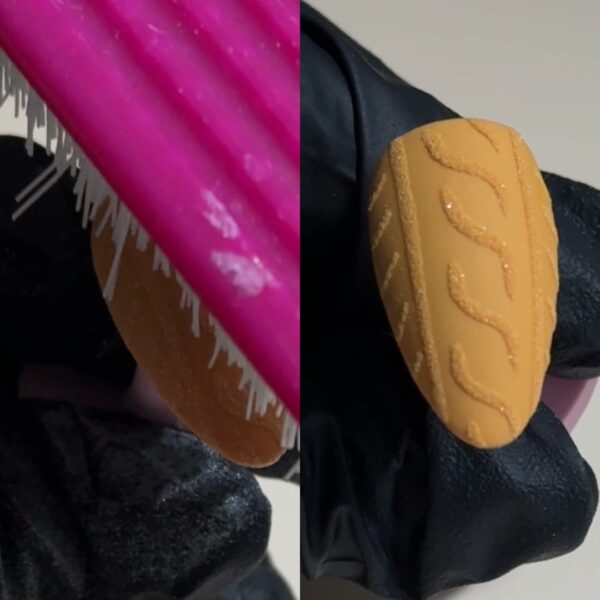 Paint the curved sweater details down the centre of the nail. Do not cure.