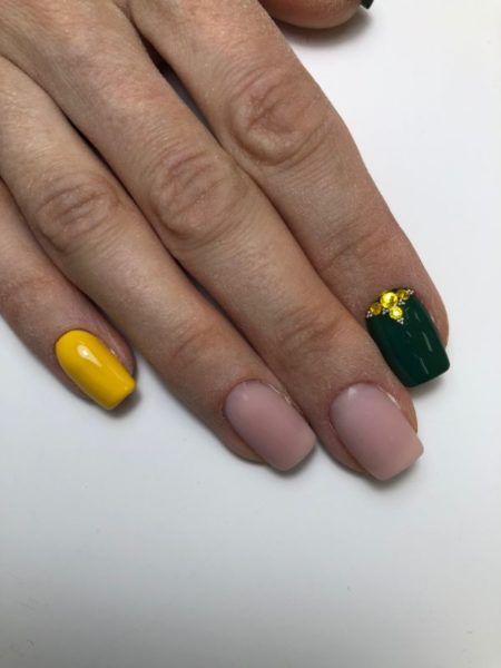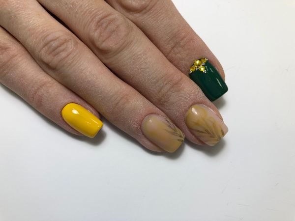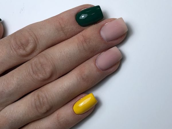 Apply two coats of CrystaLac 3-step in 3S2 (green) to the index finger nail and thumb nail and two coats of Royal Gel in R23 (yellow) to the little finger nail. Cure between each layer (2-3 minutes UV, 1-2 minutes LED).