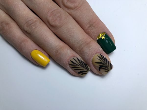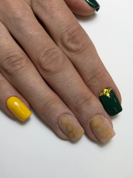 On the two nails without colour, apply Crystal Nails AquaInk drops in yellow and green. Allow to air dry, then apply a coat of Cool Top Gel and cure.