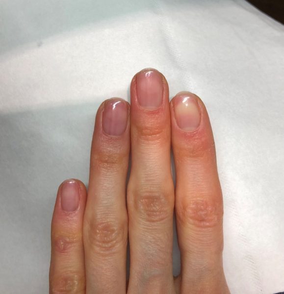 Prepare the nail for gel polish application. Apply Gellux Fast Bond to nails and allow to dry. Apply Gellux Easy Off Base Coat. Cure.