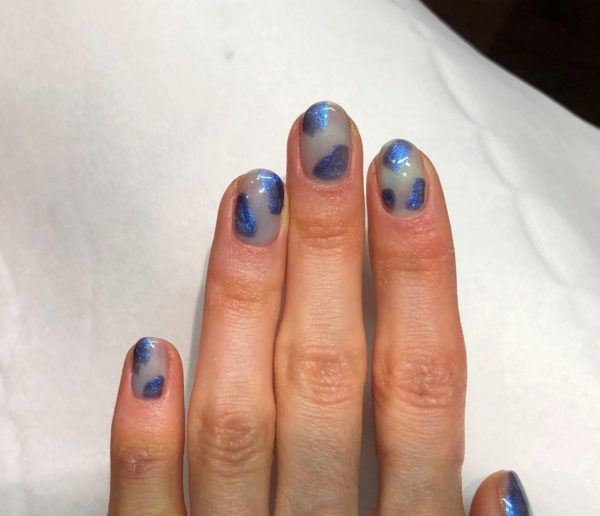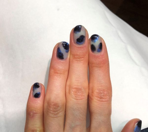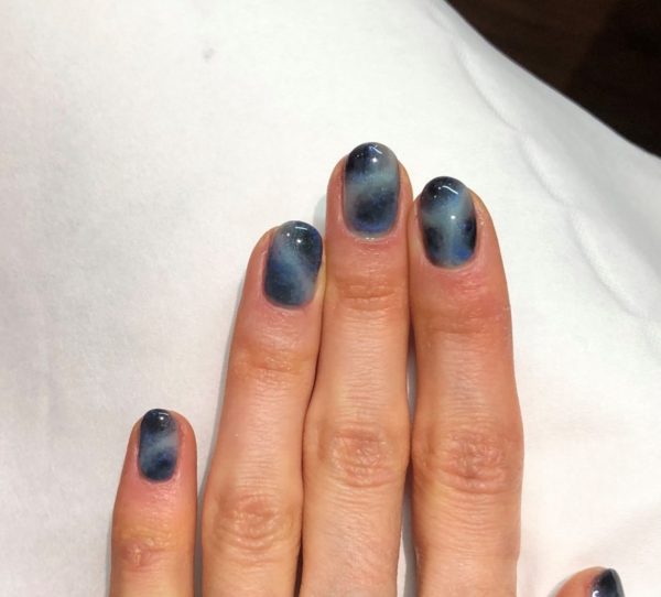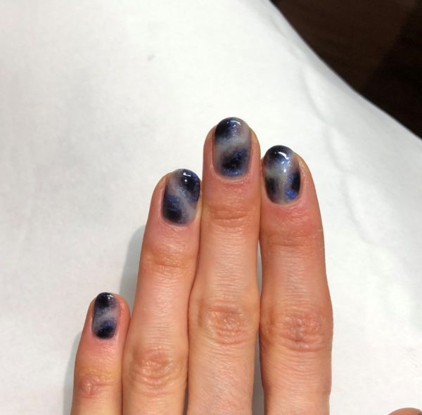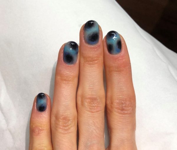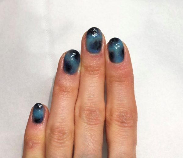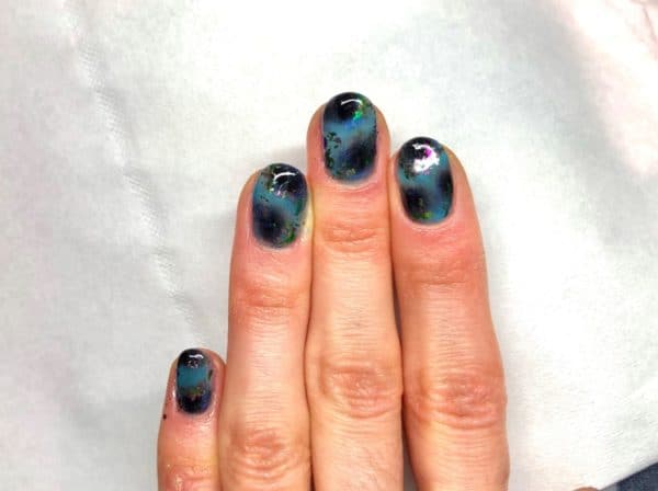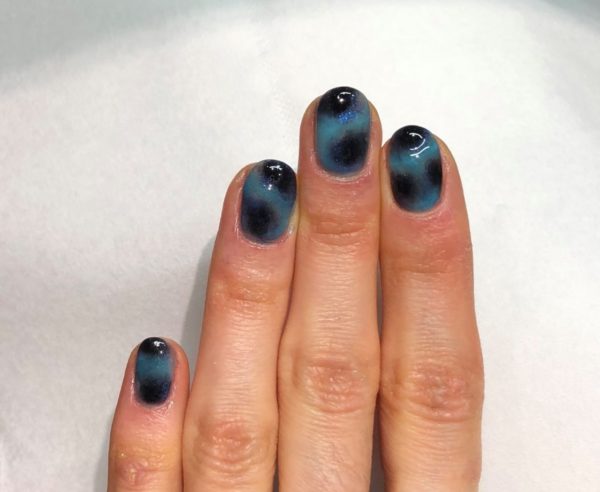 Apply more Black Onyx to the patches you created earlier. The trick is to apply in even smaller patches, so the first layer is still visible. Next, dip your gel brush into a little Catchin’ Waves and blend the patches. Cure.