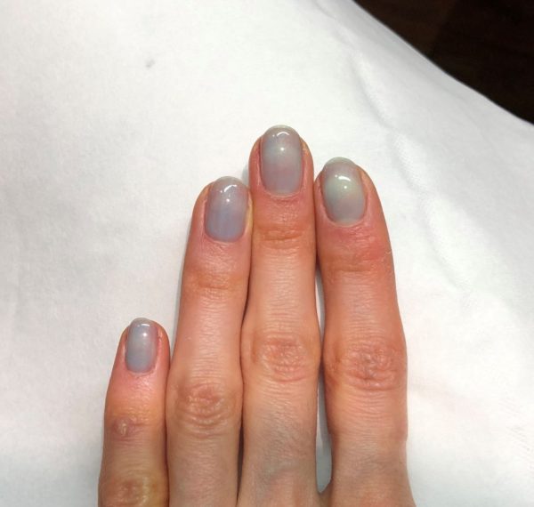 Apply another very thin layer of the sheer blue over the entire nails. Do not cure.