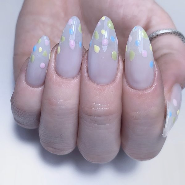 Create multicoloured gel polish shapes randomly over the nails using a detailer brush. I used The GelBottle Inc Gel Polish hues: Forget Me Not, June, Tortie and Queen Bee. Cure after each application.