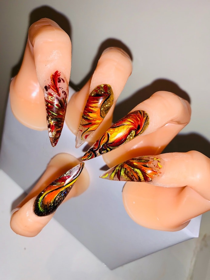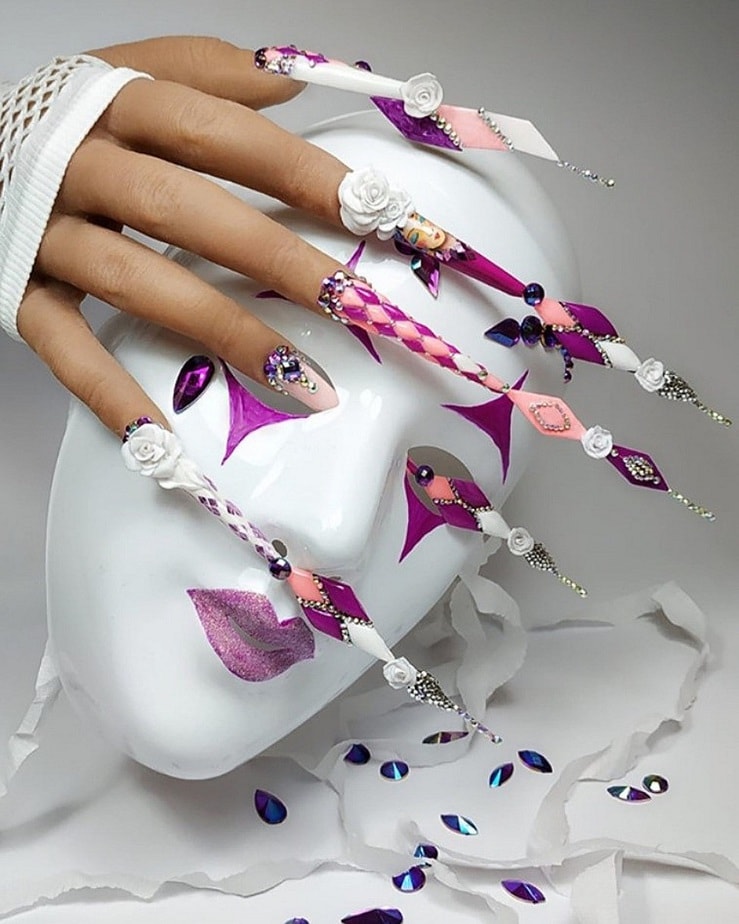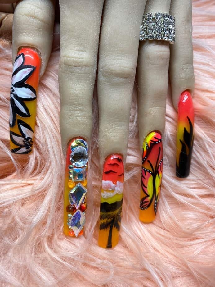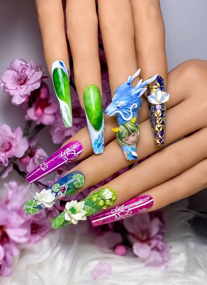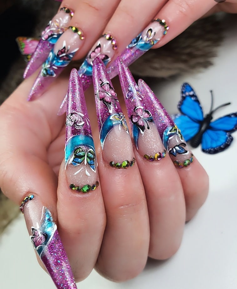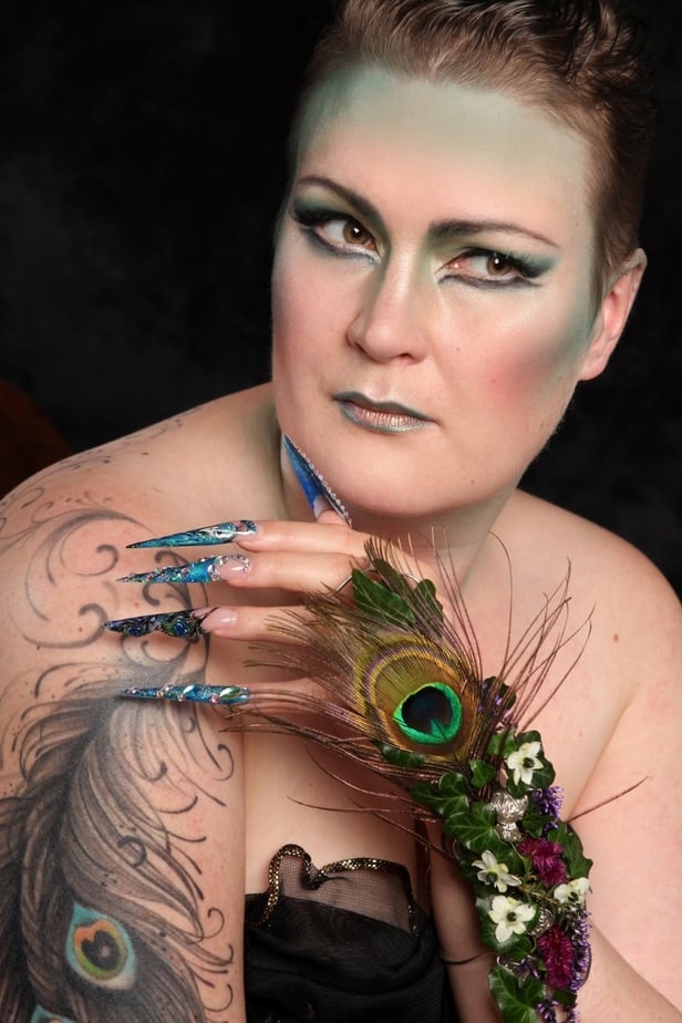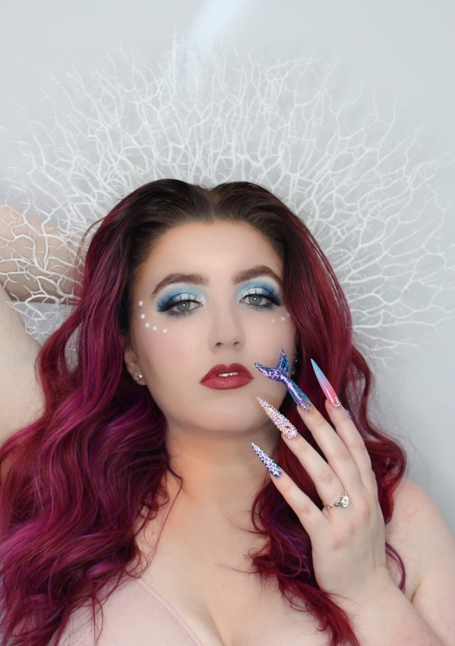 "Being a young nail tech in a small town has its challenges. I don’t often get to express myself with nail art so I took this opportunity to push myself way past my limits. This is me. I’ve never sculpted nails on myself past a number 1... these are a 4.5 which I definitely struggled with. I’ve never made any shapes out of acrylic so I tried to do my best with a mermaid tail. I don’t hand paint so I freehanded some scales, I’ve never done a full Swarovski crystal nail before but I did it. I find it hard to express myself in a small town sometimes but I think I exceeded all of my own personal expectations with this project."