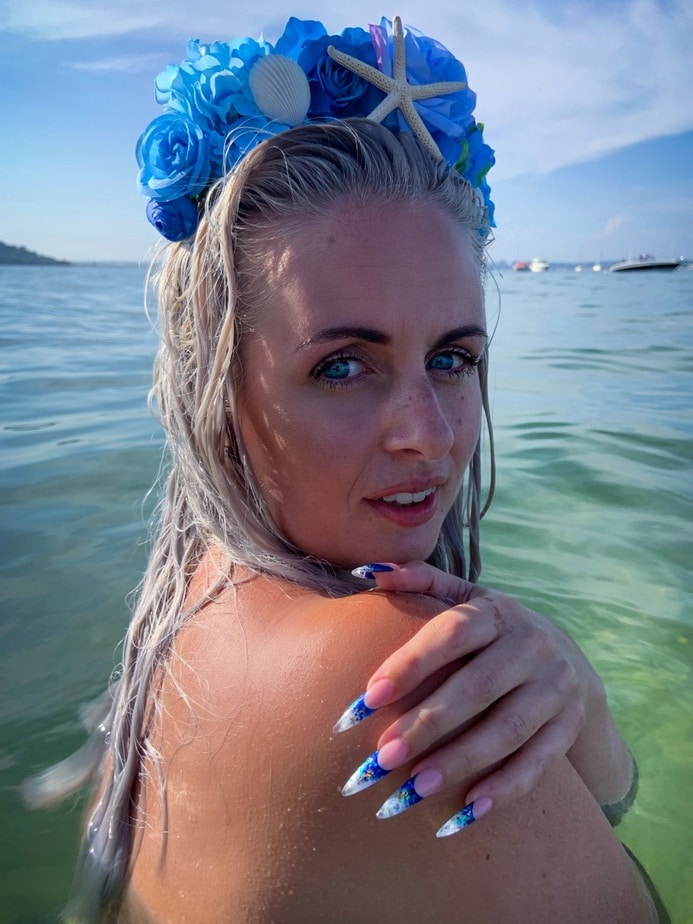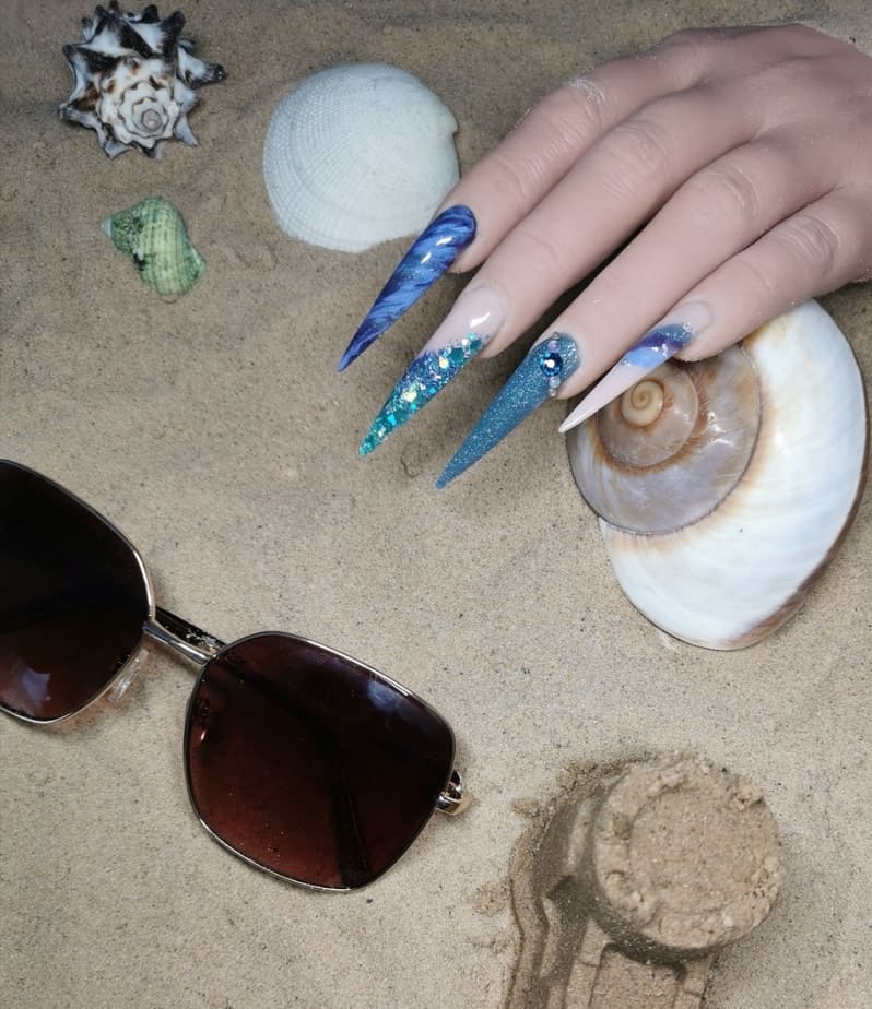 "This image couldn’t represent me stronger if I had tried. To my friends I’m nicknamed Mermicorn, because of my love of the sea and anything glitter. Even the sea glistens itself. (And naturally my favourite colour is blue.) When briefed to present myself this was my immediate choice - Me in my true happy place - which is on the south coast in Dorset. My nails also represent the glistening wash of waves, and I have to admit they are my favourite nails I’ve created on myself to date. This time has Provided great reflection for me - I have rode the storm and I’m now drifting off into the sunset."