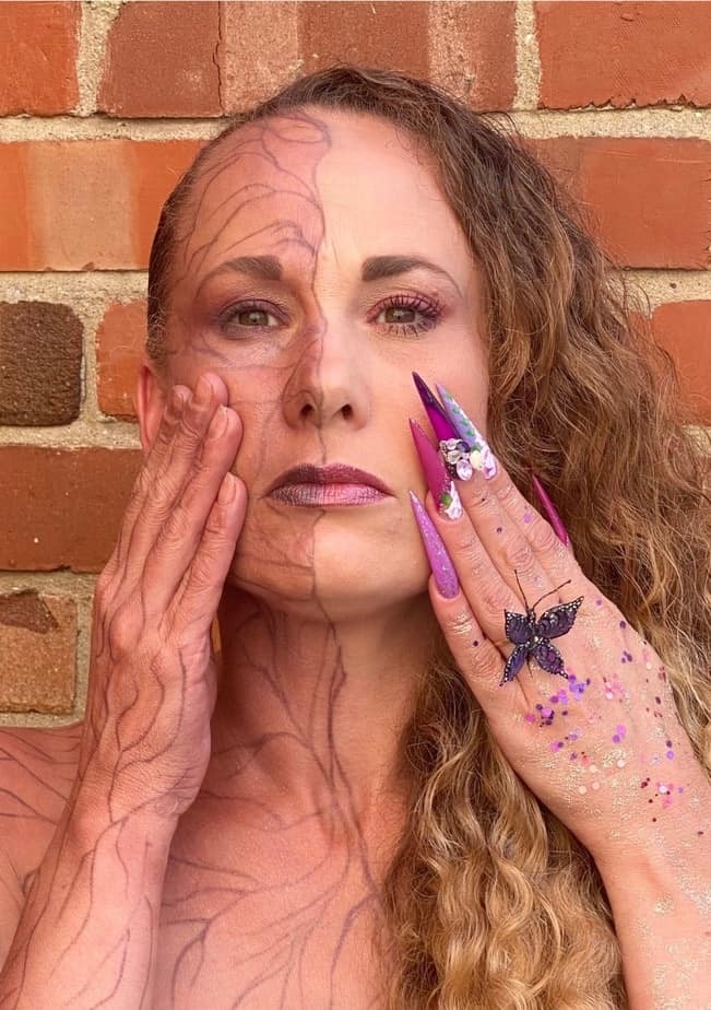 "This is me. I have chosen mental health as it’s something I have suffered with for many years the dark and the bright side suffering from many traumatic past events , the dark side showing the inner hidden pain and not wanting nails or any thing done feeling broken inside the hidden pain that isn’t clear for others to see the way mental health can effect our body to. The bright side having make up, hair and full nails done shining bright and standing proud. I have used the art of one stroke as find this so therapeutic for my mental health, roses are one of my favourite flowers which represents growth, the butterfly represents change, the crystals represent to keep shining bright. Using the nailchemy’s beautiful minds gel polish’s, acrylic and crystals from Crystal Parade. Model- make up- hair- nails - myself. Photography - My husband"