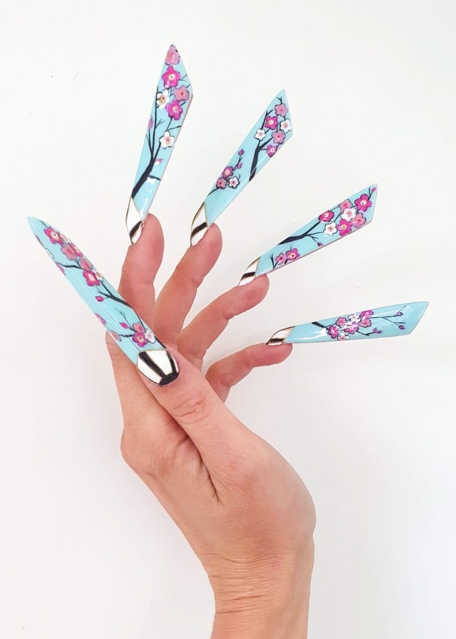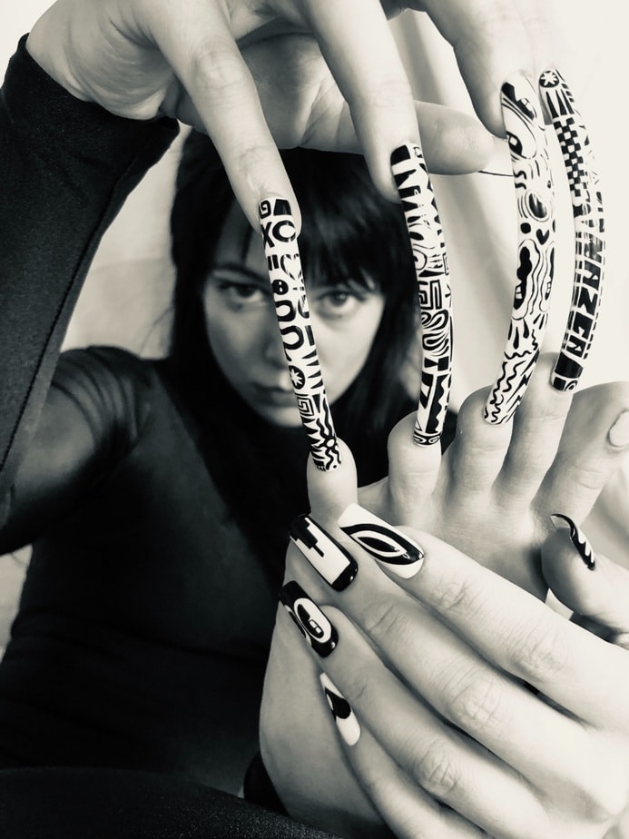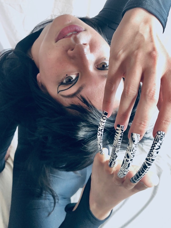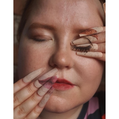 "I’m kind of quirky and edgy, but I’m still figuring out who and what I want to be. The hands and toes being joined together gives the sense of feeling trapped and compromised. Something which I am trying to break free of through doing nails. In my free time I train contortion and hand balancing for the circus and shown this through the poses I’ve done.The nail style is inspired by Hattie Stewart as I love really bold and graphic images."