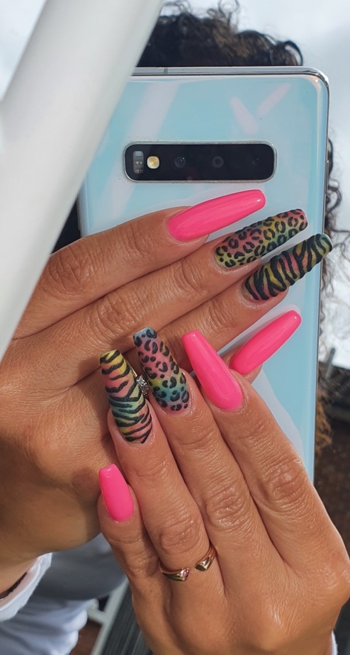 "Leopard print is like my statement print everyone associates it with me, I've done it colourful, matte and raised like winter sweater to represent my bubbly character and the bright pink is my favourite colour it always makes me smile, I absolutely love this set I've been wearing during lockdown its fun, summery and just me. It also shows off my lockdown tan a treat."