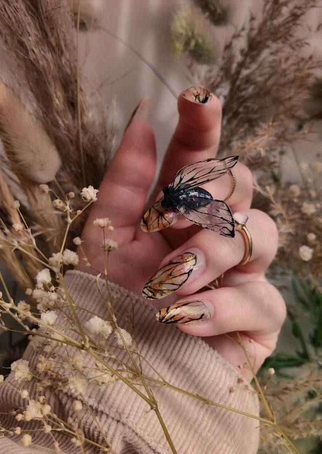 "I wanted to create an image that showcases my love of nature, fusing the effortless beauty of Mother Nature into a contemporary style which encapsulates my ethos when it comes to designing nail art. The idea was for an overall image to represent mourning the end of summer, with the fly historically used in artwork to symbolise decay and melancholia."