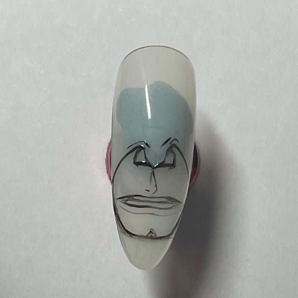 Paint your base shade and use a fine liner brush and black gel polish or gel paint to outline the nose and mouth as a starting point. Cure.