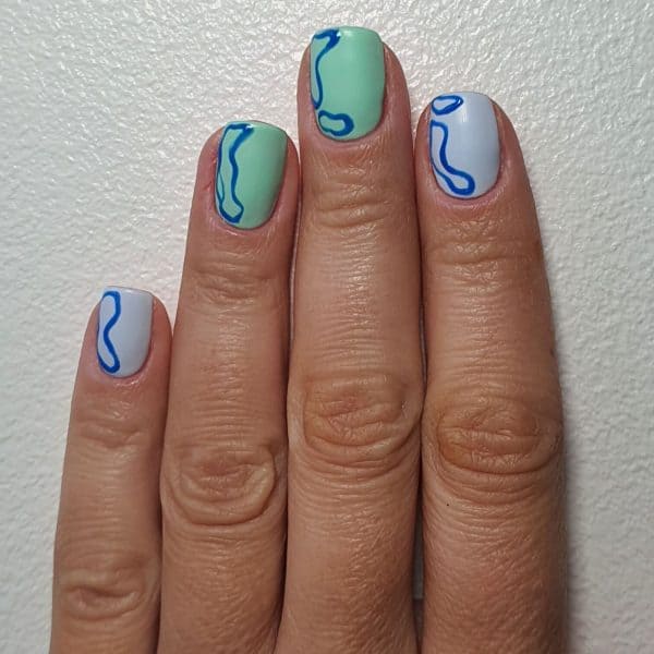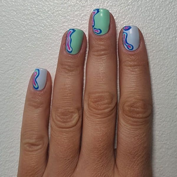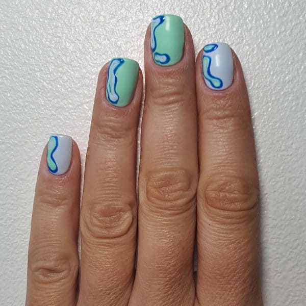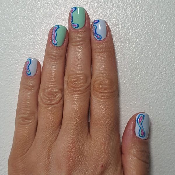 On the little fingernail, index and thumb nails, apply Gellux in Go With The Flow inside the shapes. Repeat with Gellux in Free Spirit on the middle and ring fingernails.