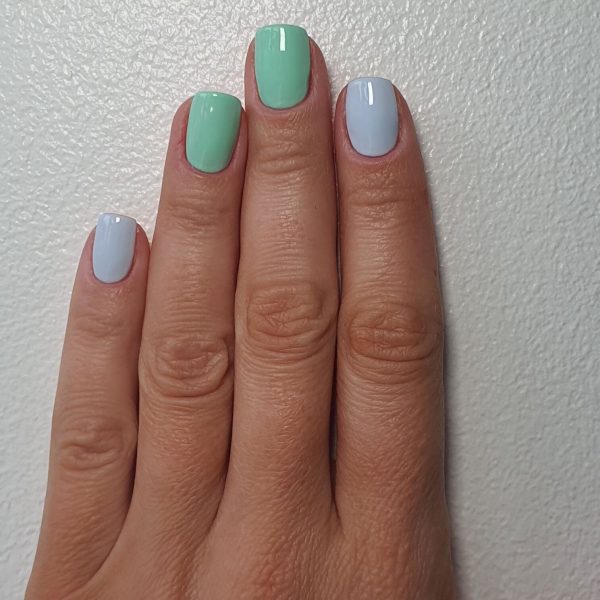 Prep the nails and wipe with Gellux Prep & Wipe. Apply a thin layer of Gellux Fast Bond and allow to dry. Apply Gellux Easy Off Base Coat and cure. Apply one coat of Gellux in Free Spirit to the thumb, index and little fingernails and apply Gellux in Go With The Flow to the middle and ring fingernails. Cure, apply a second coat, and cure.