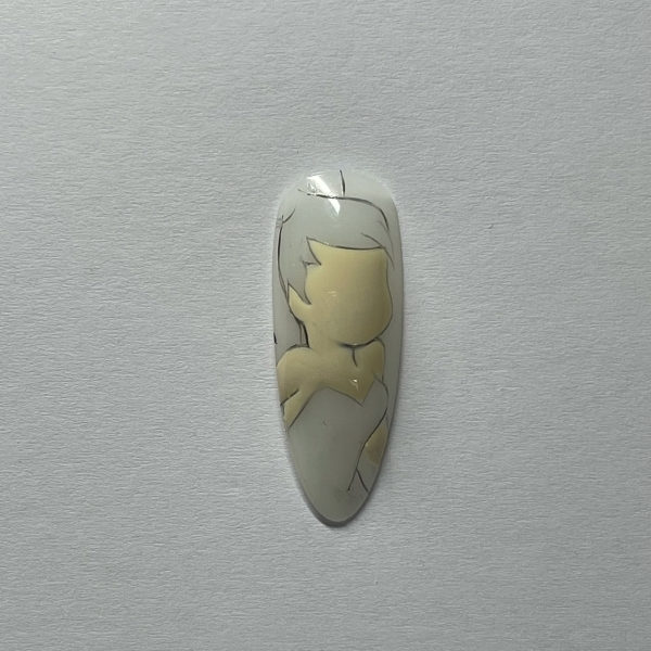 Next go in with a navy gel polish or gel paint. This will act as the night sky. Cure and then go back in with a dotting tool and add some white dots in an S-shaped pattern for fairy dust. Add a little bit of blush to her cheeks in a very pale red or dark pink, then cure