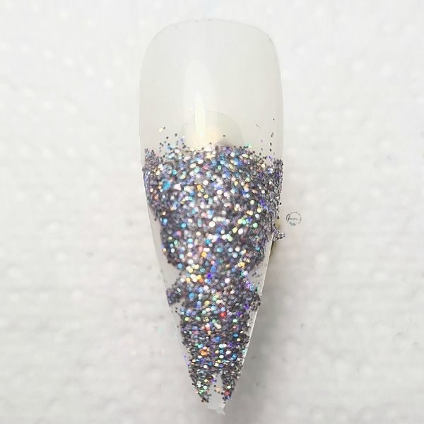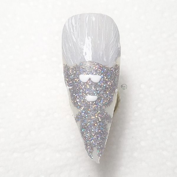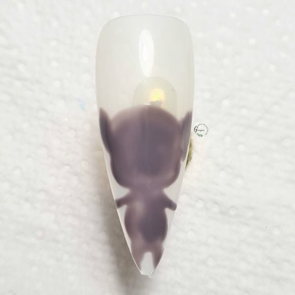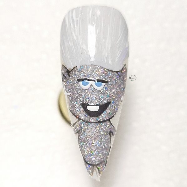 Begin by using a grey gel polish shade to paint they outline for Trolls character, Tiny Diamond, and fill. Do not cure. Sprinkle a silver glitter over the shape - an iridescent silver is best, as it will make him sparkle and shine! Cure.