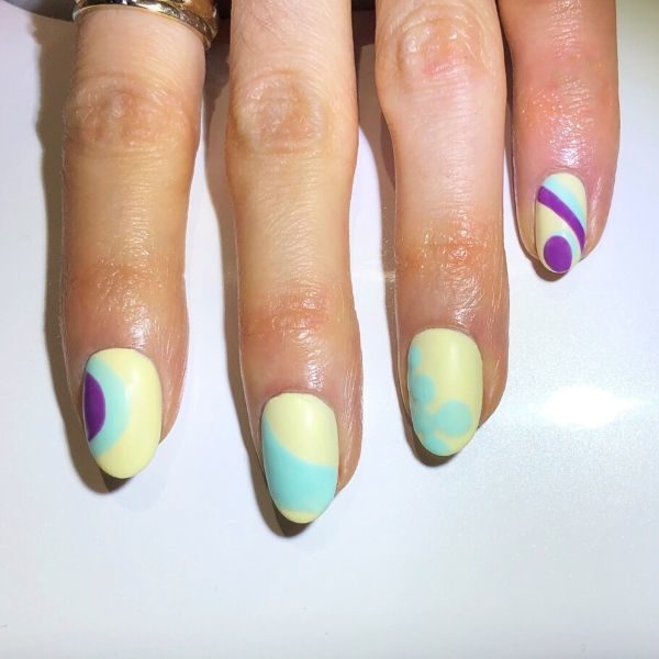 Paint shapes on the index and little finger nails using the purple Gellux hue, Yachts Of Fun, and a medium liner brush. Cure.