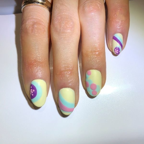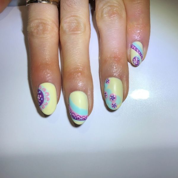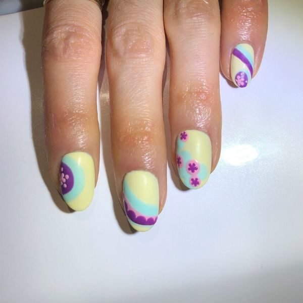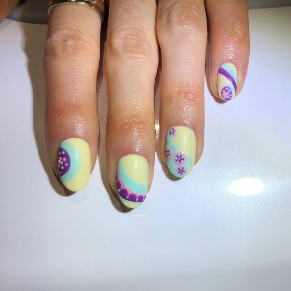 Using a small dotting tool dipped in She Sells Seychelles, create a small flower on the purple circles on the index and little finger nails by joining five dots together. Add a few more dots around them. Cure.