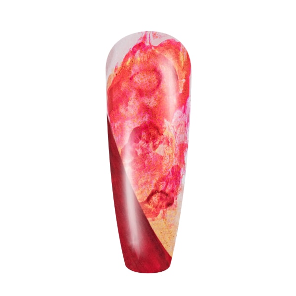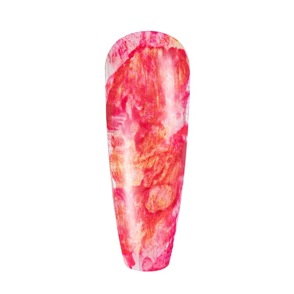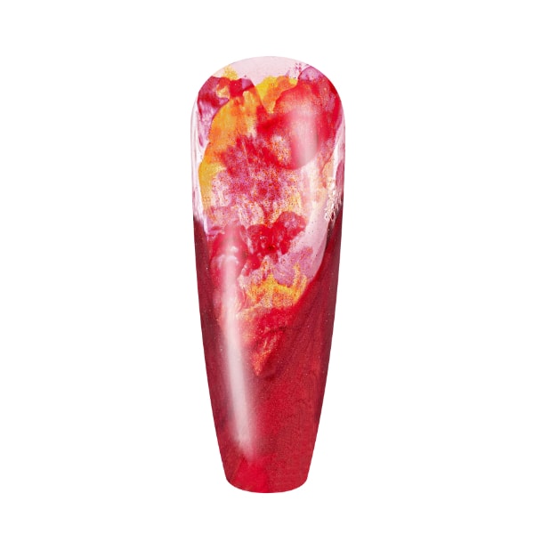 Apply one coat of OPI GelColor in Stay Strong or Stay Classic Base Coat and cure for 30 seconds in the OPI LED Light. Apply 3-4 drops of OPI GelColor in Kiss My Aries randomly to the nail. Using a oval brush dipped in N.A.S. 99 Cleansing Solution, press into the uncured colour to marble into a smoky pattern. Flash cure for 5 seconds.