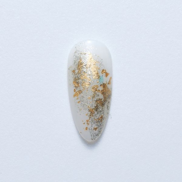Apply gold leaf to the nail as desired and touches of glittery Miss Blossom gel (#44) around the gold leaf. Cure. Apply Top Gel and cure.