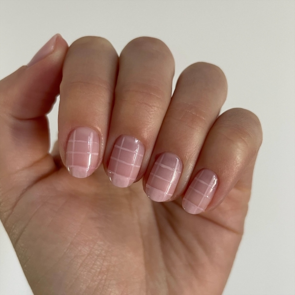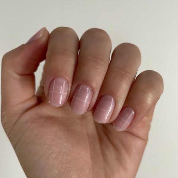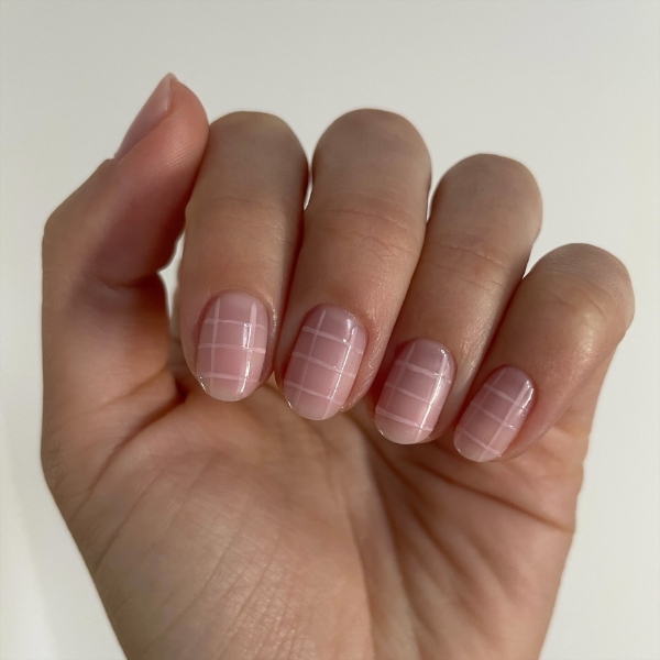 Using GELLUX gel polish in Slumber Party and a fine liner nail art brush, paint two lines vertically down each nail and cure.