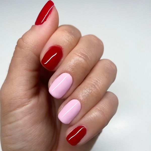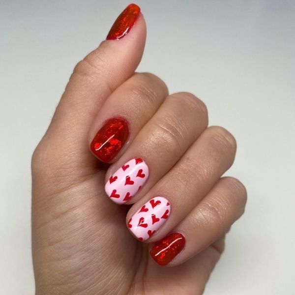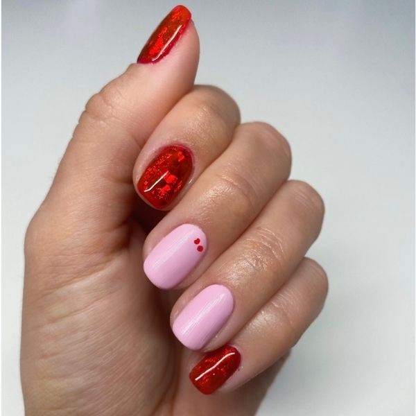 Use a dotting tool and your chosen red gel polish hue to create hearts all over the pink nails. Cure after each heart to avoid smudging.