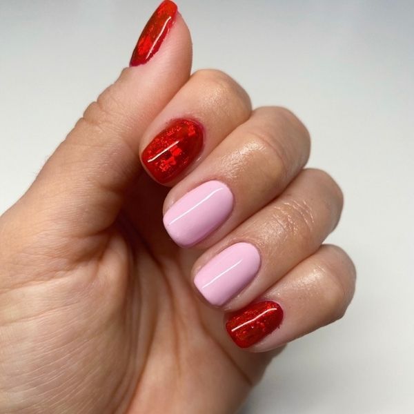 Add your chosen foil to the red nails. You should have enough sticky residue from the cured gel polish for the foil to stick.