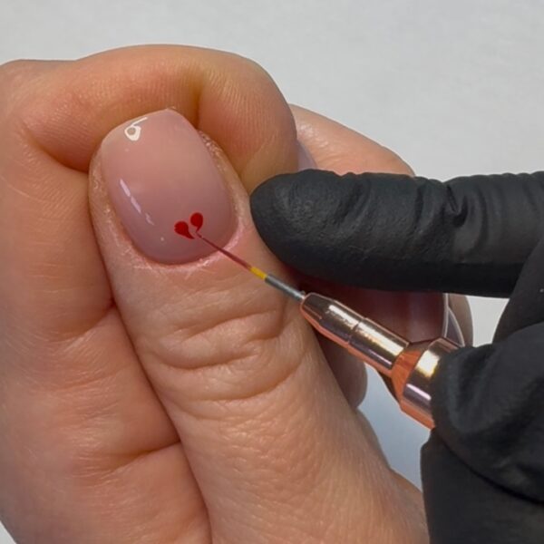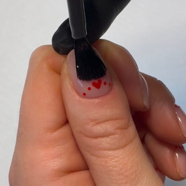 Connect each pair of dots towards the cuticle with a fine liner brush, and fill in the heart shapes. Cure.