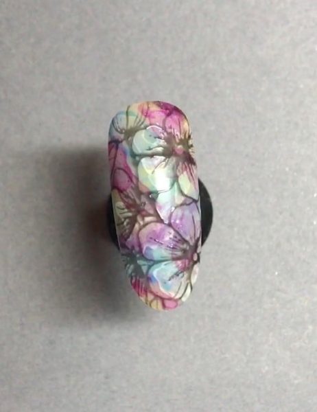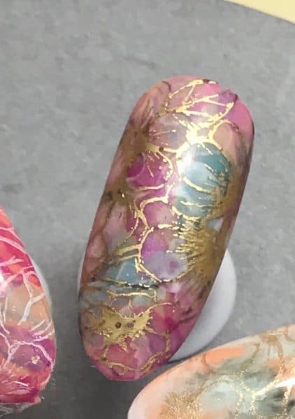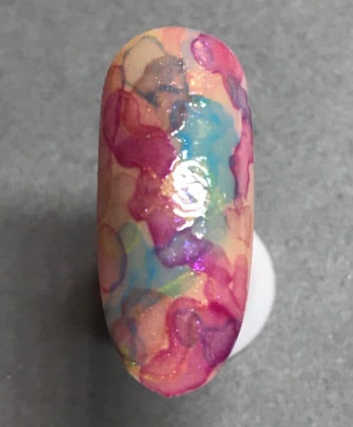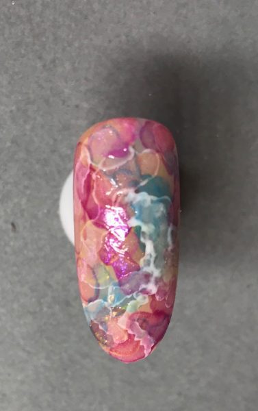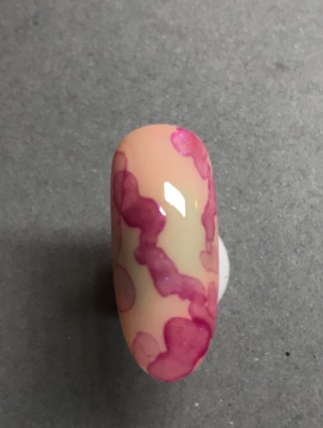 Using the Lecenté G1 brush saturate it with IPA, mix a small amount into your chosen colour to water it down. While still wet apply randomly over the nail, cure.