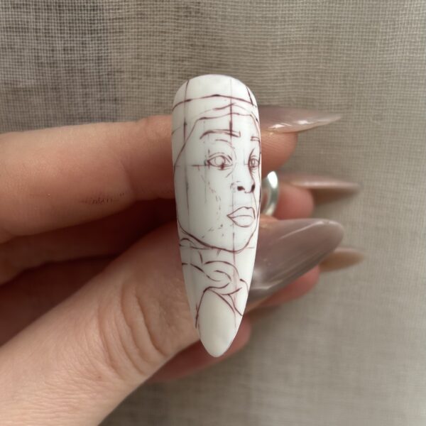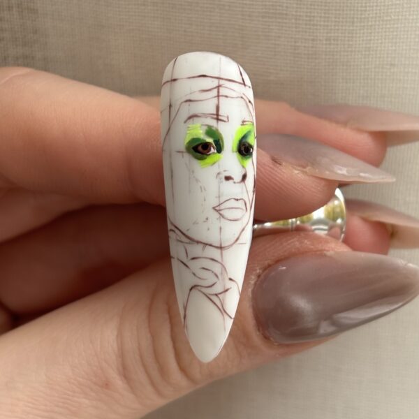Paint finer details such as eyelashes, defined eyebrows and subtle highlights within the eyes using gel paint. These elements bring the portrait to life. Flash cure when needed and once the facial details are complete, fully cure.