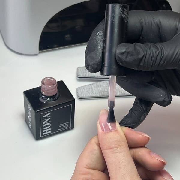 After all your prep work is done, apply the Complete Base from HONA. Follow this with your choice of base colour - I’ve chosen to use HONA PureBuild in Whisper. As this is a builder gel in a bottle, I first apply a slip layer and cure for 60 seconds. followed by my build layer, again curing for 60 seconds. This product is self levelling so I have no need to refine.