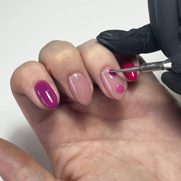 Using a dotting tool or detail brush, apply a small amount of each colour in circles to the nails without the colour, and again cure for 60 seconds. There's no need to be neat as these will just be our background.