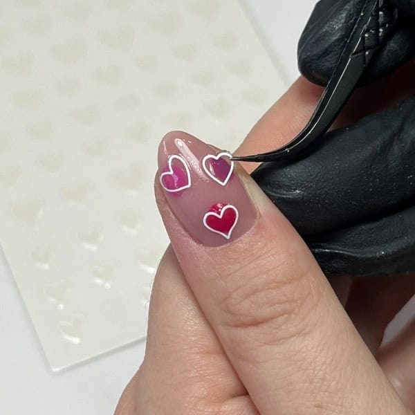 Select different size white heart outline stickers and gently peel them off the backing paper using sharp tweezers. Place these over your cured circles and using either a clean, gloved, finger or silicone tool press and smooth the sticker down.