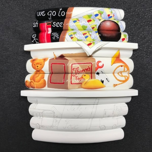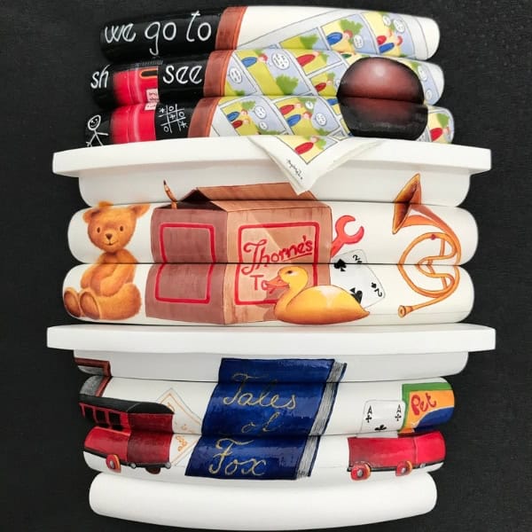 Using a nail form and white gel, create magazine sheets on the shelf. Use gel paints to create the pictures on the first part of the box.
