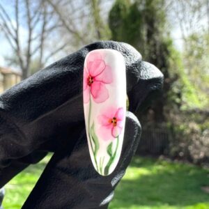 Sacramento-based nail art specialist, Alena Muraveva, shares a step-by-step for this watercolour floral style. “My nail art journey began long before I picked up a nail brush – since childhood , I’ve been immersed in painting with watercolour and oil,” she tells Scratch. “Art was always my way of seeing…