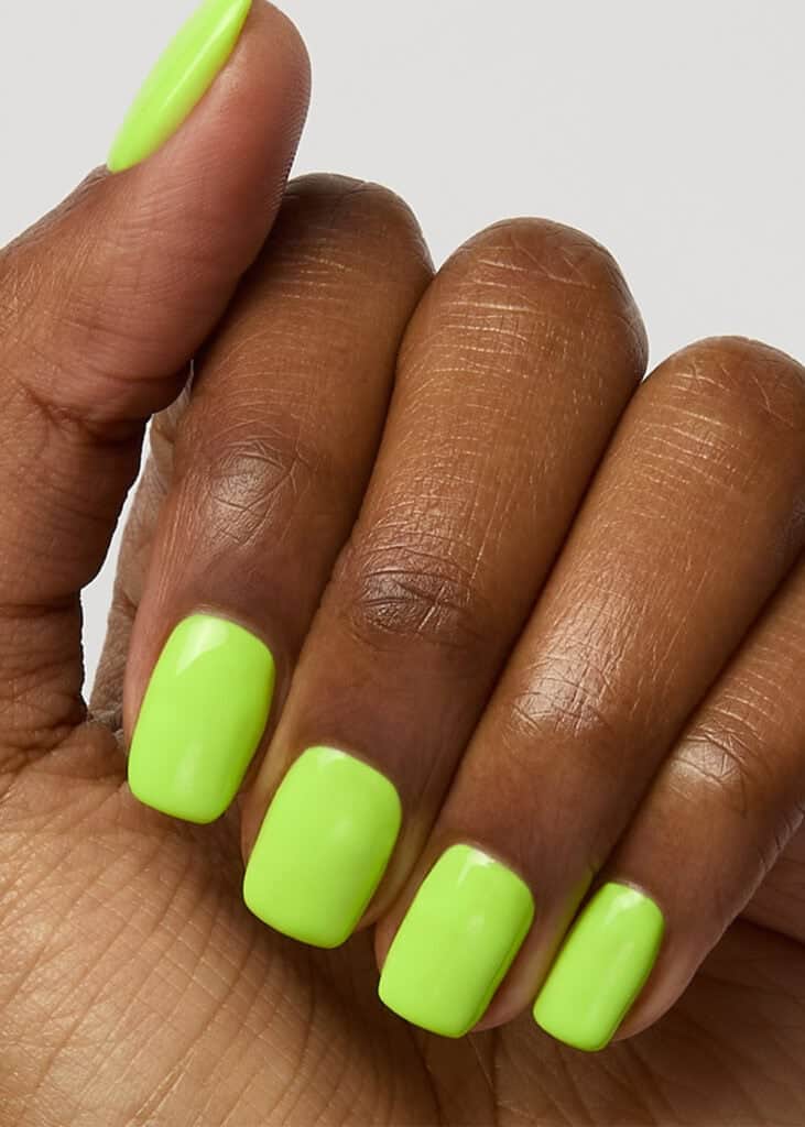 “Neon pigments contain fluorescent dyes that make colours appear brighter under a UV lamp. While neon gel products cure, the fluorescence and colour intensity can be altered in comparison to how they appear under a UV lamp.”