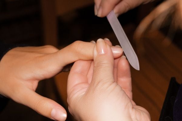 The team used the GERmanikure Finox Ergonomic Nail Clipper and Sungienic nail file to shape the nails to a short, soft almond nail shape. The Glass Manicure Stick was used to removed dead skin and calluses and Finox Ergonomic Coil Spring Cuticle Nipper for hang nails.