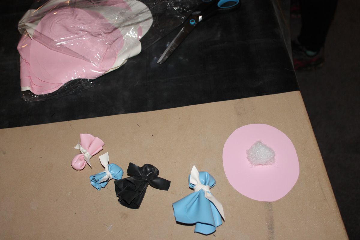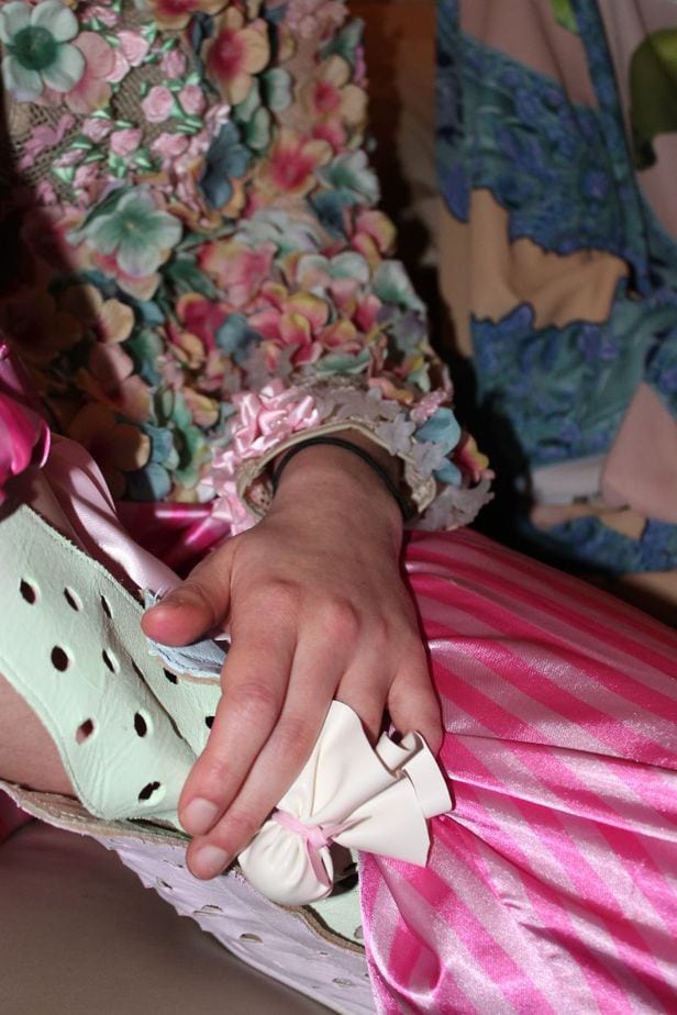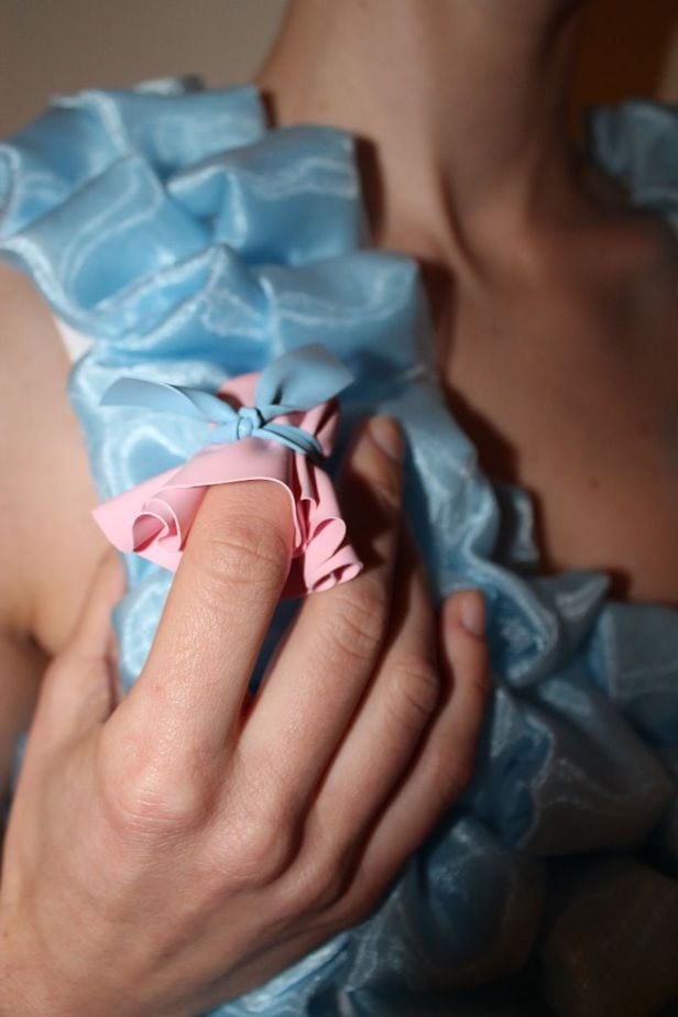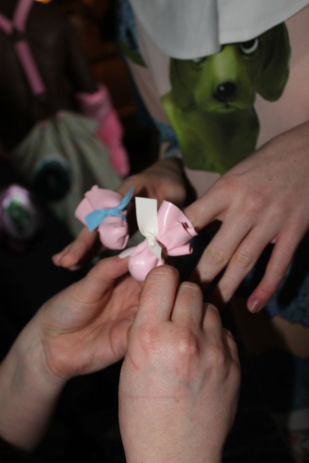Once the models had been dressed in the latest collection, the hand look was completed with ‘finger dummies’. Created with a circle of sustainable latex-like material, a small amount of padding was placed in the centre before being tied with a strip of latex, creating almost a lolly pop effect. These were then slipped on one finger on each of the model’s hands.