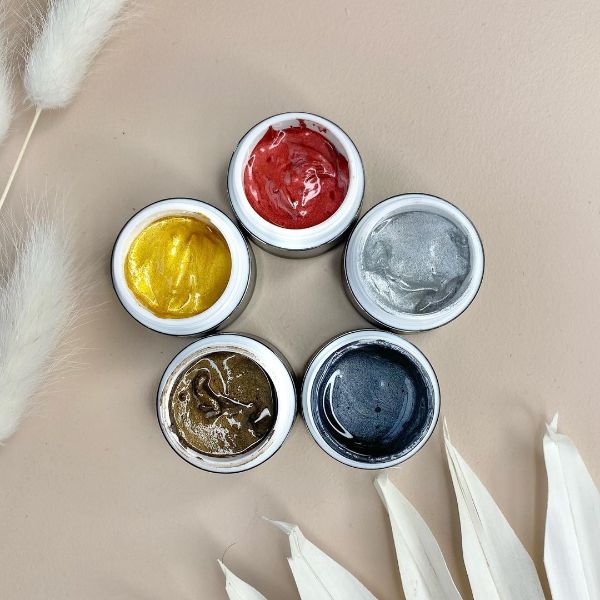 The five metallic gel paste colours are Hematite (a grey/black), Silver, Gold, Bronze and Goldstone – a red hue.