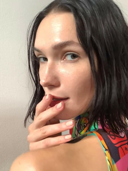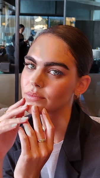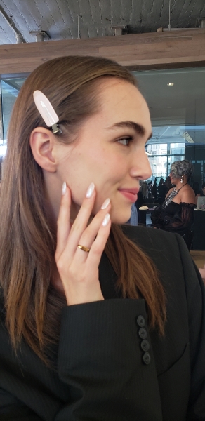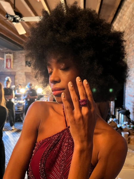 Working with Pamella to keep the focus on the fabrics from her collection, Pattie created nail extensions with pearlescent hues to recreate the on-trend, subtle ‘glazed donut’ nail style.