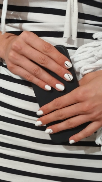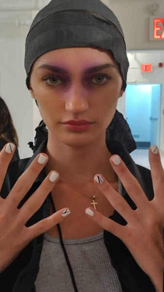 In collaboration with the designers and stylist, Pattie decided on bold black and white nails with graphic lines to fit with the monotone pieces in the collection, as well as the chunky Doc Martins worn.