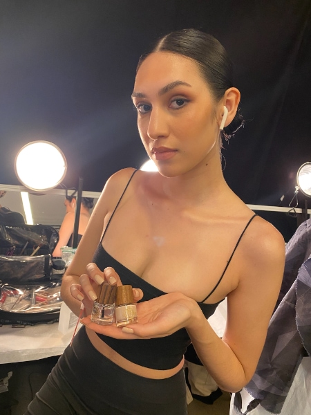 The nail looks were selected by the designers, taking inspiration from Pattie’s Instagram. Nude shades to suit the model’s skin tones were used, with crystals and pearls applied to the base of each nail to complement the details of the collection.