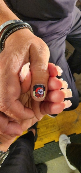 - Custom NFT stickers were then applied to three nails and sealed with Protect Top Coat.