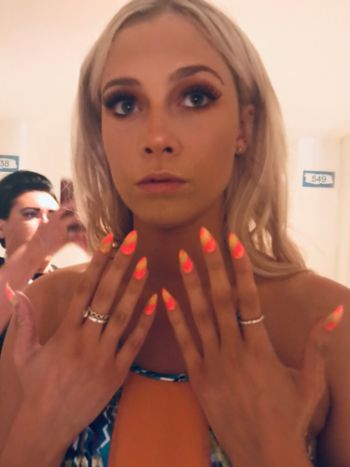 “As is always the case with fashion shows, unexpected and sometimes unfortunate things happen and this led to us also turning ours hands to make-up to get the models catwalk ready. Ibiza Fashion Festival organiser, Karen Windle, and I decided to apply a shimmer gel to the models’ décolletage, alongside a bronzed glow to the face, a nude lip and a rose gold eyelid. Half the team did make up and half finished applying the custom made tips in a neon tie dye style, while the hair team; Liz Usher and Georgia Gellender from Hair By Vogue, gave the models a sassy beach wave look. Liz and Georgia are both Goldwell 2019 finalists and we are already organising a second collaboration with them.
