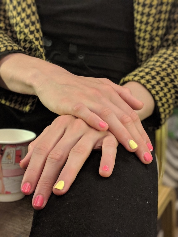 Neon nails pop courtesy of Bio Sculpture at Paul Costelloe LFW