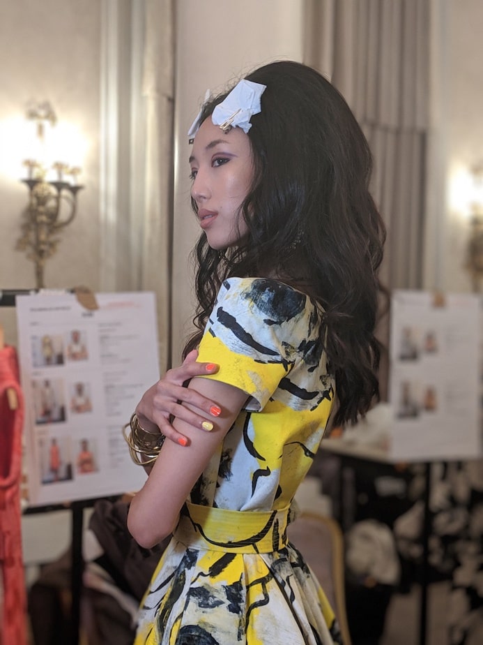 The bright hues complemented the patterns and prints of the clothing collection showcased at the Waldorf Hilton, London.