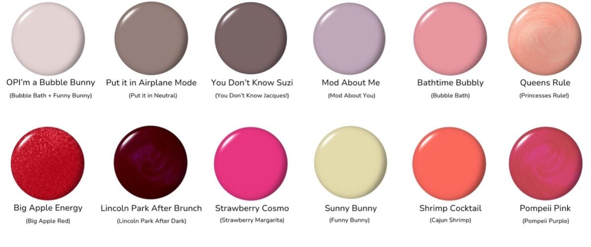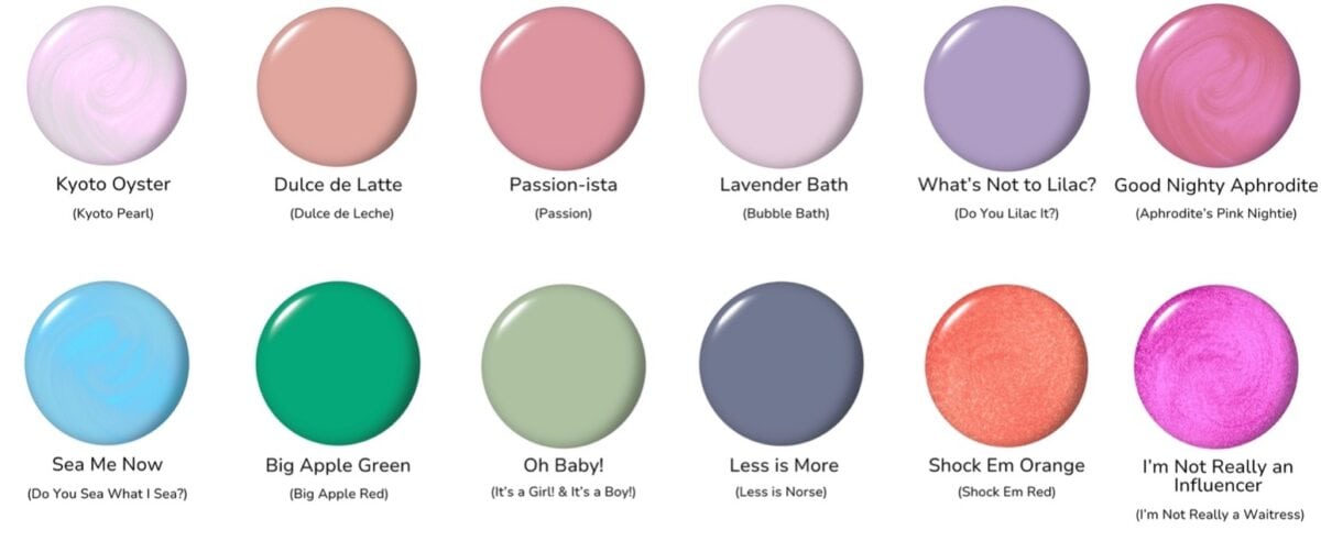 - Rose, hot pink and bright fuchsia hues: Bathtime Bubbly, Strawberry Cosmo, Pompeii Pink, Passion-ista, Good Nighty Aphrodite and I’m Not Really an Influencer. These draw inspiration from classic favourites: Bubble Bath, Strawberry Margarita, Pompeii Purple, Passion, Aphrodite’s Pink Nightie and I’m Not Really a Waitress.