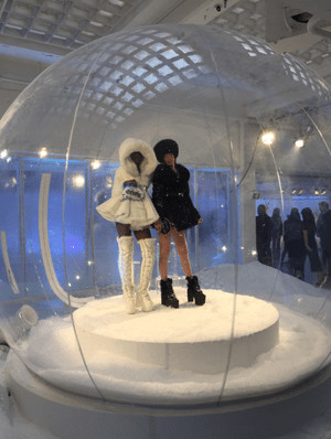 Feeling both surprised and amazed by my new surroundings, I first took in the sight of a huge snow globe containing two models posing for guests. Instantly it became clear that this was going to be no ordinary catwalk show.