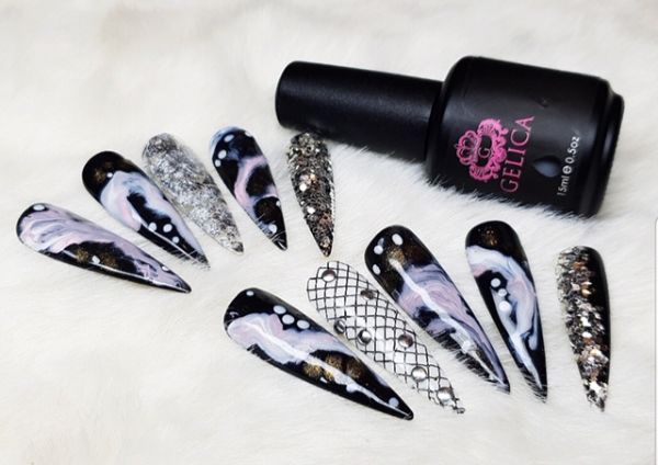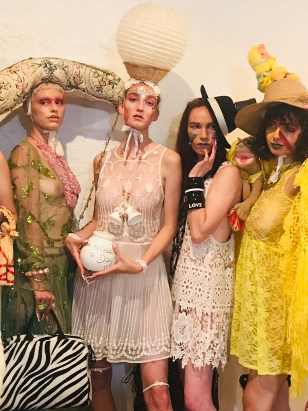 The nail team, comprising Suzanne, Em Lee, Sophie Donaldson, Lauren Lenoir, Georgia Hardwicke and Sheniene Lebond, tended to the nails of 50 models, creating over 600 nails using Gelica Gel products and various craft materials on clear stiletto tips.