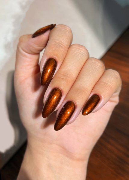 - Amber – Amber is a glass-effect orange shade that’s warm and intriguing. Imagine the clarity and colour of that ’70s collectable retro glassware and you’re almost there. A high-gloss shade that has drama and elegance in equal amounts.