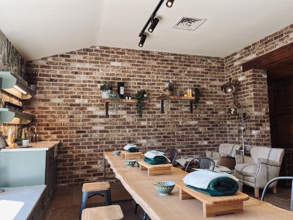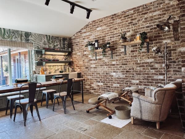 The Nail Yard at Archerfield uses organic elements with soft, chic features to create a natural, cosy and luxurious feel, designed by interior designer Siân Parry Jones. With oak wood features seen both in the flooring and the nail bar tabletop, the salon also features a woodland sanctuary-themed wallpaper, helping to bring the outside in.